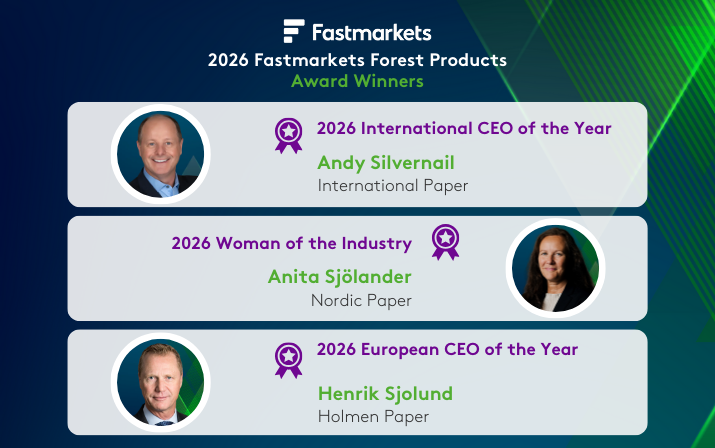 Fastmarkets has announced its 2026 Forest Products industry awards, recognizing three executives for outstanding leadership in a challenging market environment.